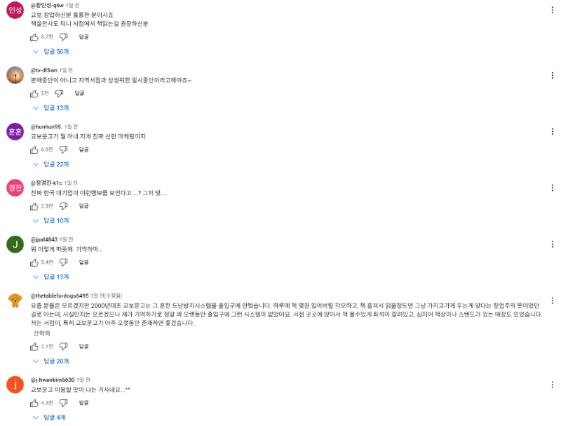 대중들 역시 그동안 교보문고가 쌓아온 브랜드 스토리를 이해하며 교보문고를 칭찬하는 미담을 소개하고 있다. 실제로 위에 소개한 YTN 뉴스 기사의 댓글들을 살펴보면 대부분 위에 소개한 교보문구의 브랜드 스토리들을 언급하며 교보문고에 대한 칭찬을 대중들이 댓글로 남기고 있다. 교보문고는 판매 일시 중단 조치로 매출을 손해 봤을지 몰라도 브랜드 헤리티지를 유지하며 수억 원 대의 광고도 하지 못한 브랜드 광고 효과를 보는 데 성공했다.