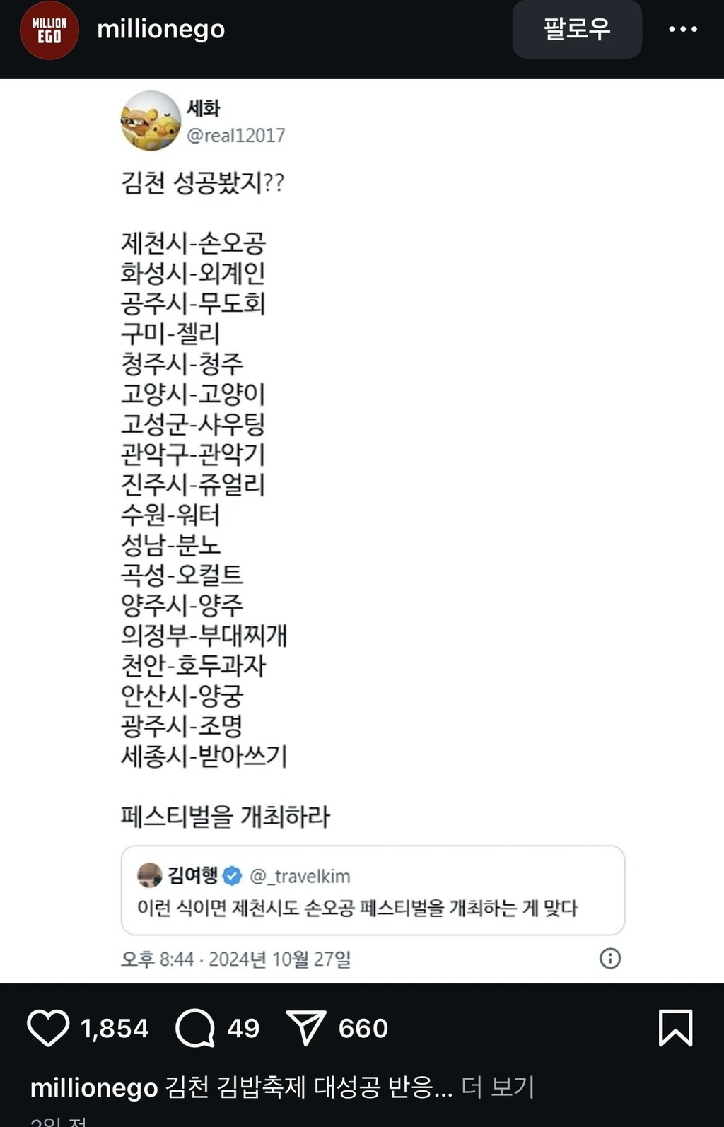 첫 번째는 '밈'화 될 수 있는 콘텐츠의 성격이다. 즉 콘텐츠의 성격이 누구나 응용하기 좋은 성격을 가지고 있다. 누구나 '김천시가 김밥천국 축제했대'라는 말만 들어고 축제의 성격이나 내용을 쉽게 이해할 수 있어 확장성이 좋다. 실제로 소셜미디어를 화성시는 외계인, 고성군은 샤우팅 축제, 제천시는 손오공 축제를 만들자는 재밌는 제안들이 나오고 있다.