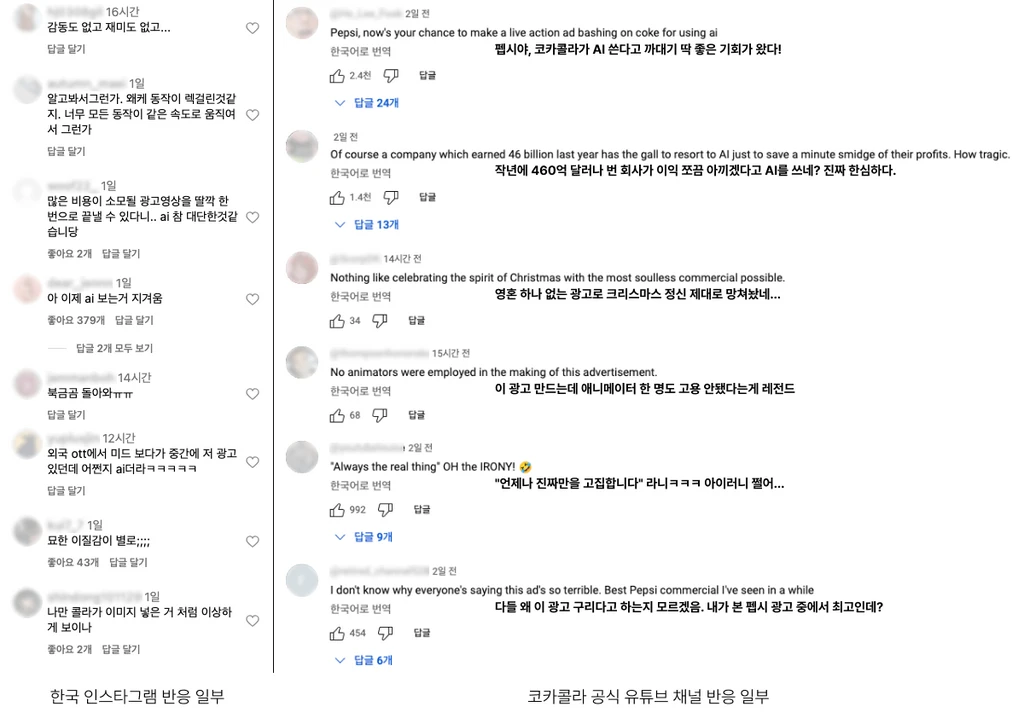 다만 이러한 우려의 목소리에 대해 다른 시각도 존재합니다. 일각에서는 코카콜라의 이번 시도를 단순히 비용 절감을 위한 선택으로 보기는 어렵다고 지적합니다. 실제로 코카콜라는 이번 시즌에도 전통적인 방식의 광고를 함께 제작했으며, AI 제작 과정을 굳이 외부에 공개하지 않아도 됐음에도 이를 전면에 내세웠습니다.