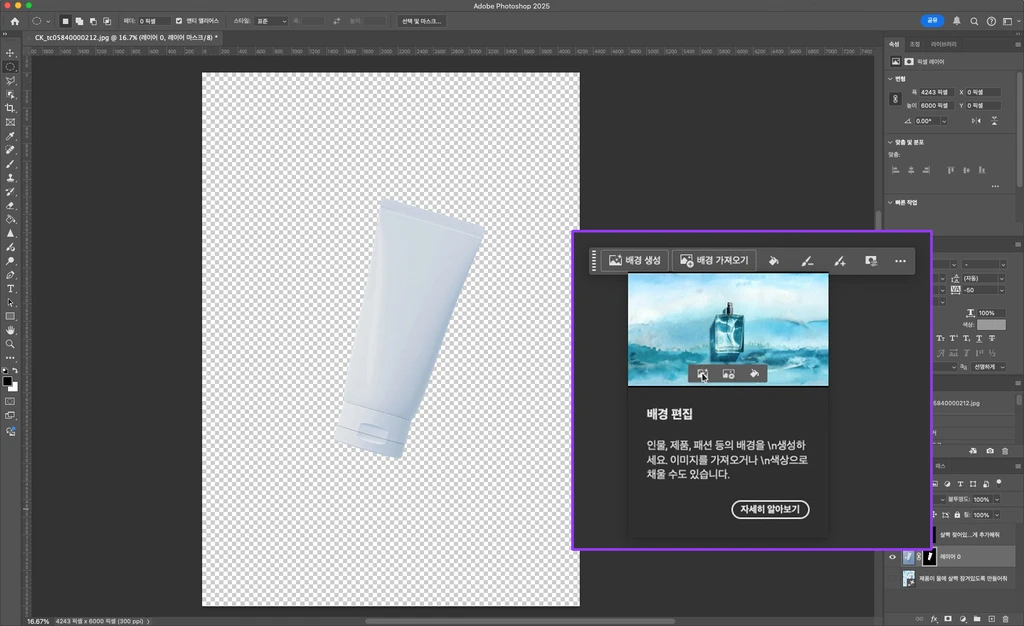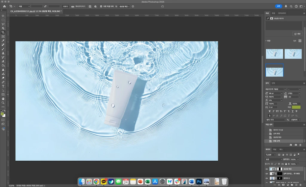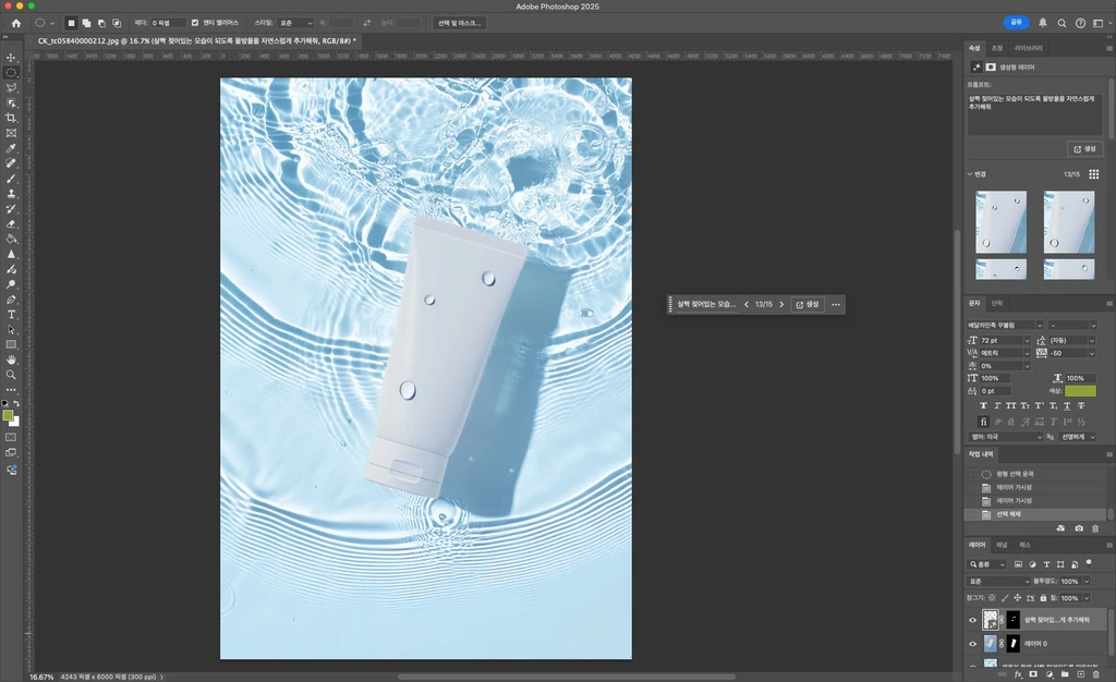 먼저 포토샵에서 배경이 제거된 제품 이미지를 가져왔어요. 상황별 작업 표시줄에 나타나는 [배경 생성] 버튼을 눌러서 프롬프트를 입력해 줍니다. 저는 수분이 가득한 제품이라는 것을 강조하고 싶기 때문에 ‘제품이 물에 살짝 잠겨있도록 만들어줘’라고 입력했어요! 프롬프트는 영어가 아닌 한글로 작성해도 잘 작동되었습니다.