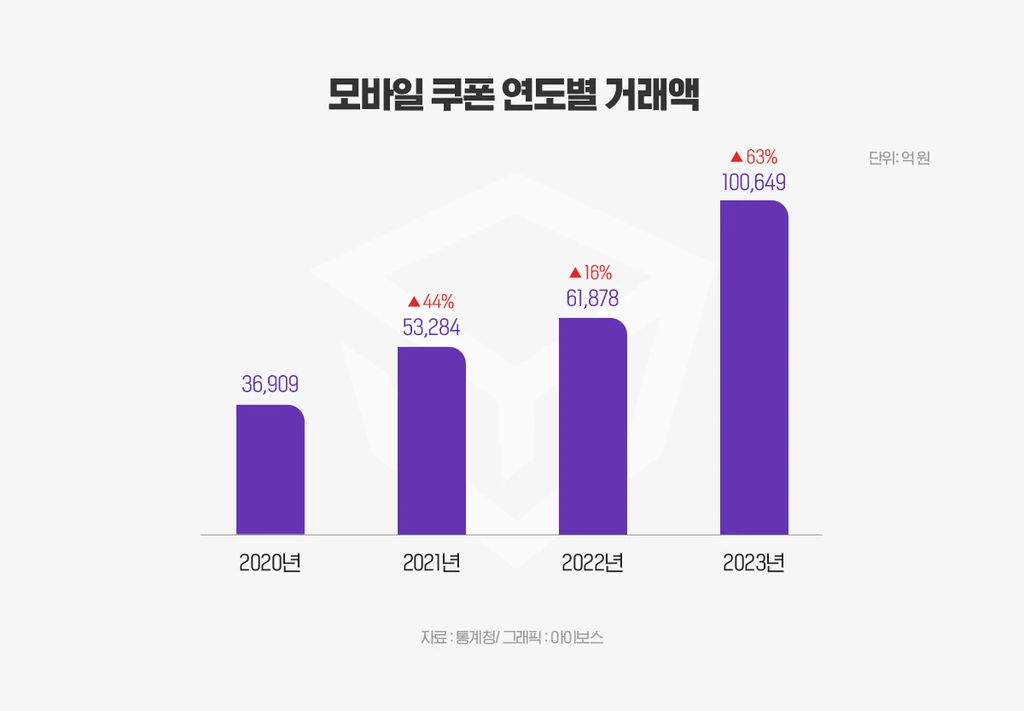 통계청이 발표한 온라인쇼핑 거래액 자료에 따르면, 지난 6월의 모바일 쿠폰 거래액은 9,506억 원으로 2023년 6월에 비해 27.1% 늘었습니다. 이 상승 추세는 계속되고 있어서 월 거래액은 곧 1조 원을 넘어설 것으로 보입니다. 특히 코로나19로 비대면 선물하는 문화가 일상으로 자리 잡으면서 2020년 3조 6,909억 원, 2021년 5조 3,284억 원, 2022년에는 6조 1,878억 원을 기록했고, 지난해는 10조 649억 원으로 급증했습니다.