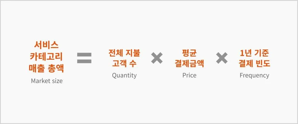 ​보다 구체적으로 설명하자면, '전체 지불 고객의 수(Quantity)' '결제 1건당 평균 금액(Price)', 그리고 '결제 빈도(Frequency)'를 파악하고 곱하여, 해당 서비스 카테고리의 '카테고리 매출 총액(시장규모, Market size)'을 숫자로 파악하는 작업을 먼저 진행하는 것이지요.