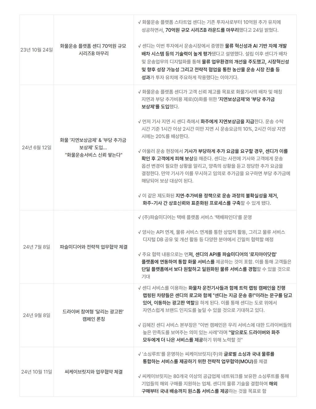이러한 활동들을 종합해보면, 센디는 현재 단순한 '용달화물기사 중개 플랫폼'에서 벗어나 '신뢰성 있는 종합 운송 플랫폼'으로 도약하려는 움직임을 보이고 있습니다. 특히 서비스의 신뢰도 강화와 플랫폼 확장성 확보에 많은 투자를 하고 있는 것으로 보입니다.