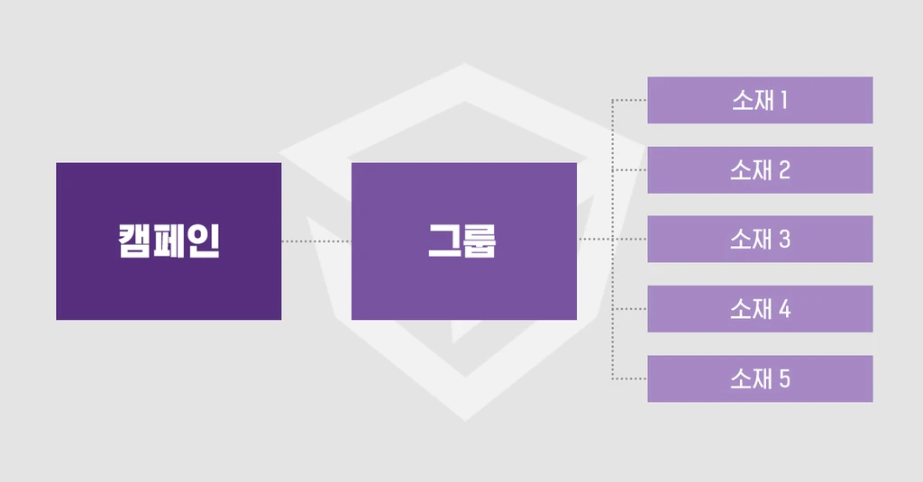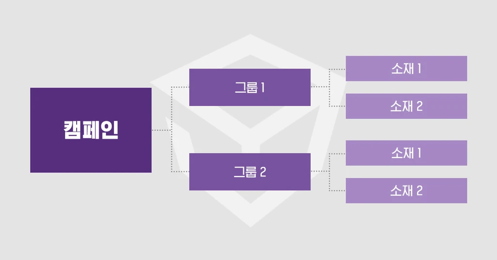 캠페인 1개 - 그룹 1개 - 소재 5개 이상 또는 그 이상 세팅하는 방식입니다. 캠페인 세팅 초기, 성과 좋은 소재를 위와 같이 세팅하여 구분하고, 타깃을 추가한다면 캠페인 속에 1개 그룹을 더 넣기도 하죠.