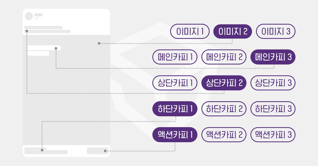 이렇게 다양하게 조합되면서 노출되다가 머신러닝에 의해 성과지표가 목표치에 가깝게 나타나는 소재 조합 위주로 집중 노출되는 형태로 좁혀가는 방식입니다. 다양한 소재를 세팅하여 확인할 때 이 방식이 유용하게 사용되겠죠?