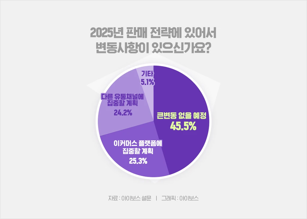 마지막으로 2025년 판매 전략에 대해 질문했는데요. '큰 변동 없을 예정'이라는 응답이 45.5%(45명)로 큰 비중을 차지하고 있지만, '다른 유통채널' 혹은 '이커머스 플랫폼'에 집중할 계획이라는 응답 또한 49.5%(49명)로 변화의 움직임을 엿볼 수 있었어요. 올해 성과를 기준으로 방향성을 수정할 수도 있겠죠!