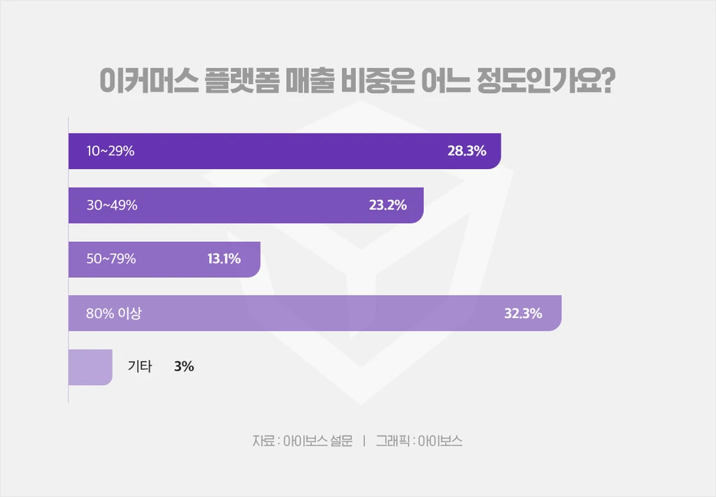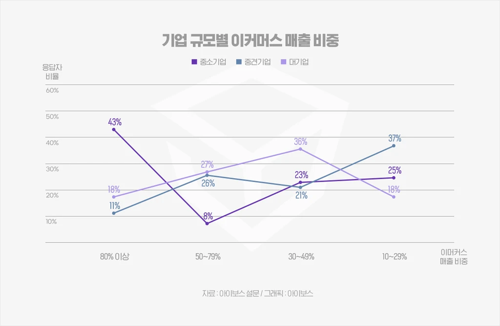 기업의 규모와 함께 보면 중소기업의 경우, 매출의 80% 이상을 이커머스 플랫폼에 의존하는 비율이 43%로, 중견기업 11%, 대기업 18%에 비해 상대적으로 높은 것으로 파악됐어요.