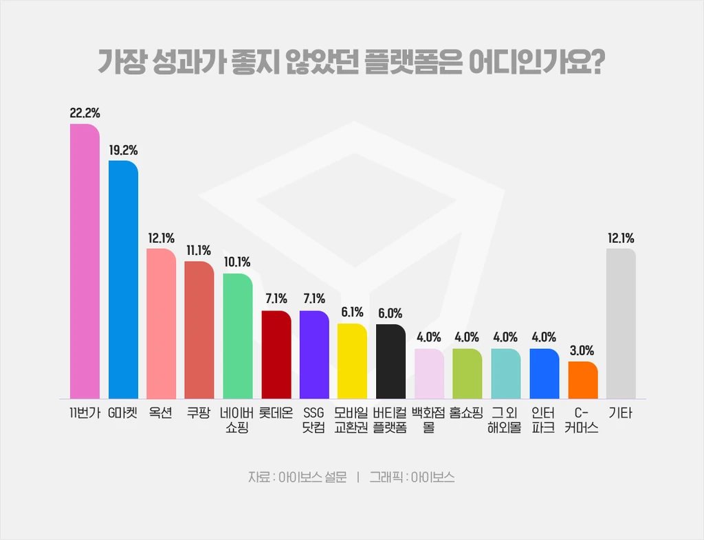 다음으로, 가장 성과가 좋지 않았던 플랫폼을 묻는 질문에 대한 응답은 비교적 고루 분포된 모습인데요. 다만, 11번가 22%, G마켓 19.2%, 옥션 12.1%로 종합몰 형태의 오픈마켓 플랫폼들이 상위권을 차지했어요. 곧바로 쿠팡과 네이버쇼핑이 각각 11.1%, 10.1%로 뒤를 이었죠. 11번가, G마켓, 옥션을 합치면 53.5%로 오픈마켓의 성과가 저조했다고 응답한 이용자가 많다는 걸 확인할 수 있어요.