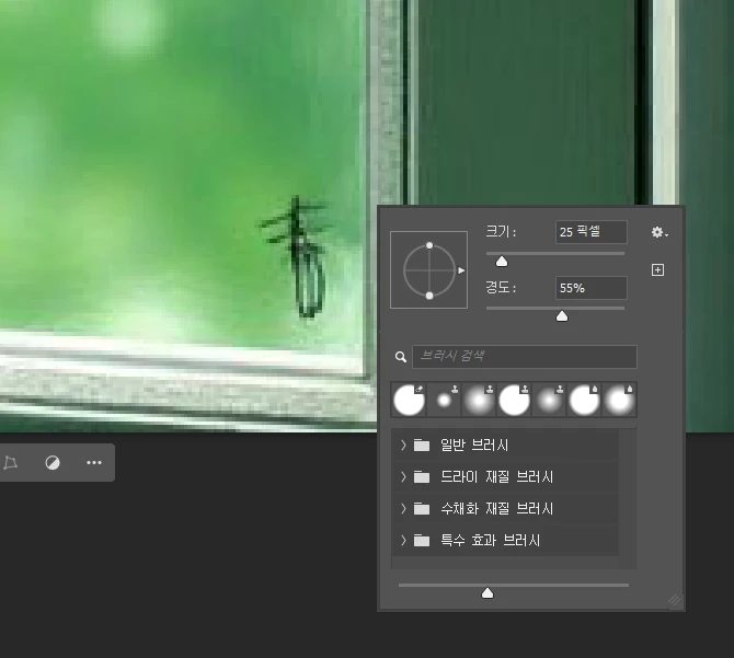 ALT키를 꾹 누른 상태에서 복사할 부분을 클릭해줍니다. 얼룩을 지우기 위해 바로 위의 창문 틀을 클릭했습니다. 마우스 우클릭을 하면 위 이미지와 같이 크기와 경도를 선택할 수 있습니다. '경도'는 100%일 때 가장 날카롭게 칠해지며, 경도가 낮아질 수록 주변 부위가 부드럽습니다. 너무 날카로우면 합성티가 나니 적당히 20% 정도로 세팅합니다.