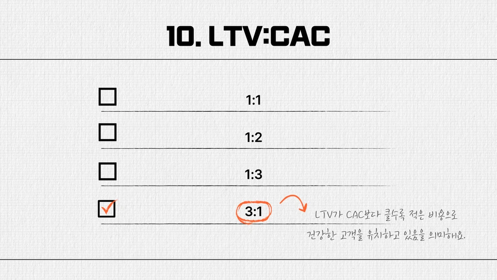 따라서 가장 건강한 LTV:CAC 비율은 LTV가 CAC보다 큰 경우에요. 이는 고객을 획득하는 데 드는 비용의 세 배에 해당하는 가치를 고객이 창출하고 있음을 의미해요. 이 비율은 기업이 고객 획득에 투자한 비용을 충분히 회수하고, 추가적인 이익을 얻고 있음을 보여줘요.