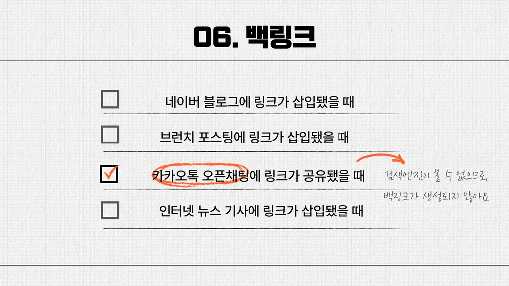 카카오톡 오픈채팅에 링크가 공유됐을 때는 백링크가 생성되지 않아요. 카카오톡과 같은 메신저 플랫폼에서 공유된 링크는 검색 엔진 크롤러가 접근할 수 없기 때문이에요. 검색 엔진은 웹 페이지의 공개된 링크만 인덱싱하고 평가할 수 있으며, 비공개 또는 제한된 접근의 링크는 백링크로 인식하지 않아요.