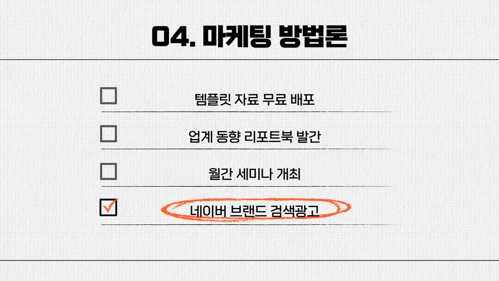 네 가지 마케팅 방법 중 네이버 브랜드 검색 광고는 다른 방법들과 성격이 달라요. 템플릿 자료 무료 배포, 업계 동향 리포트북 발간, 월간 웨비나 개최는 모두 콘텐츠 마케팅(Content Marketing)의 일환으로, 유용한 정보를 제공해서 잠재 고객의 관심을 끌고 리드를 생성하는 마케팅 전략이에요. 이런 방법들은 주로 교육적이고 정보를 제공하는 것이 목적이며, 고객과의 신뢰를 쌓는 데 중점을 둬요. 반면에, 네이버 브랜드 검색 광고는 유료 광고(Paid Advertising)의 일종으로, 검색 엔진에서 특정 키워드로 검색할 때 브랜드를 상단에 노출시키는 방식이에요.