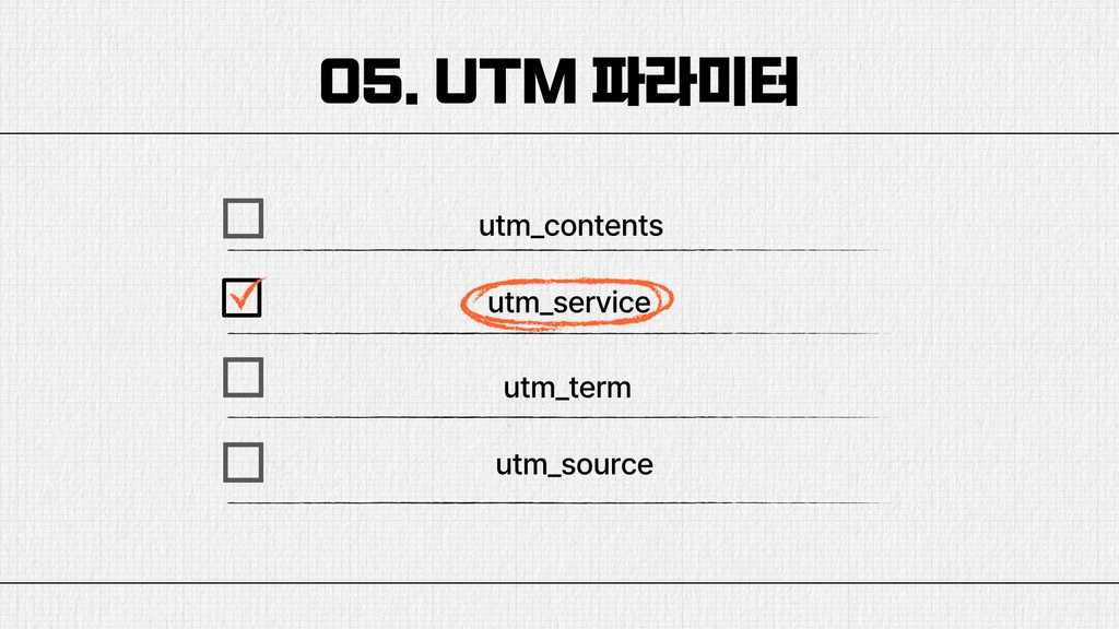UTM 파라미터는 마케터들이 캠페인의 성과를 추적하고 분석하기 위해 사용하는 URL 매개변수예요. 표준 UTM 파라미터에는 다음과 같은 다섯 가지가 있어요.