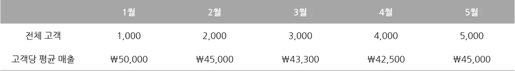 온라인 쇼핑몰의 데이터를 통해 코호트 분석으로 얻을 수 있는 가치를 살펴보겠습니다. 해당 쇼핑몰은 1월 1일부터 운영을 시작하였고, 1월부터 5월까지 전체 고객 수와 고객당 평균 매출액은 아래와 같습니다.