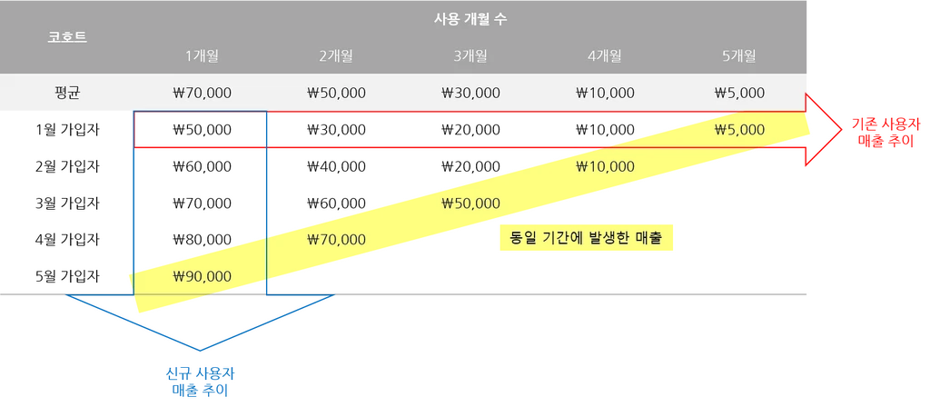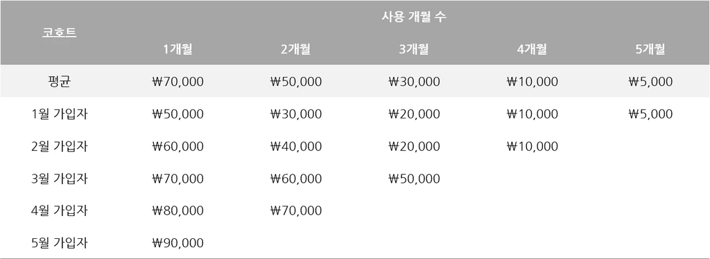 위의 표는 온라인 쇼핑몰의 고객들을 가입 시기별로 그룹화하여 시간에 흐름에 따라 매출액 변화를 살펴본 코호트 분석 결과입니다. 이 분석 결과를 어떻게 해석해야 할지 아래에서 설명 하겠습니다.