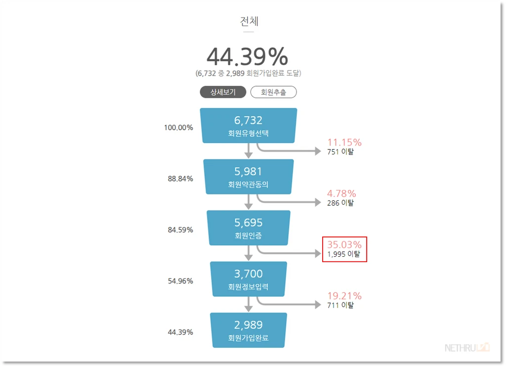 분석 결과 회원 인증 단계에서 35.03%로 가장 많은 사용자가 이탈하는 것을 알 수 있네요. 그렇다면 회원 인증을 좀 더 쉽게 할 수 있도록 수정하거나, 도움말을 추가하여 사용자가 중도 이탈하지 않고 인증을 완료할 수 있도록 해야겠습니다.