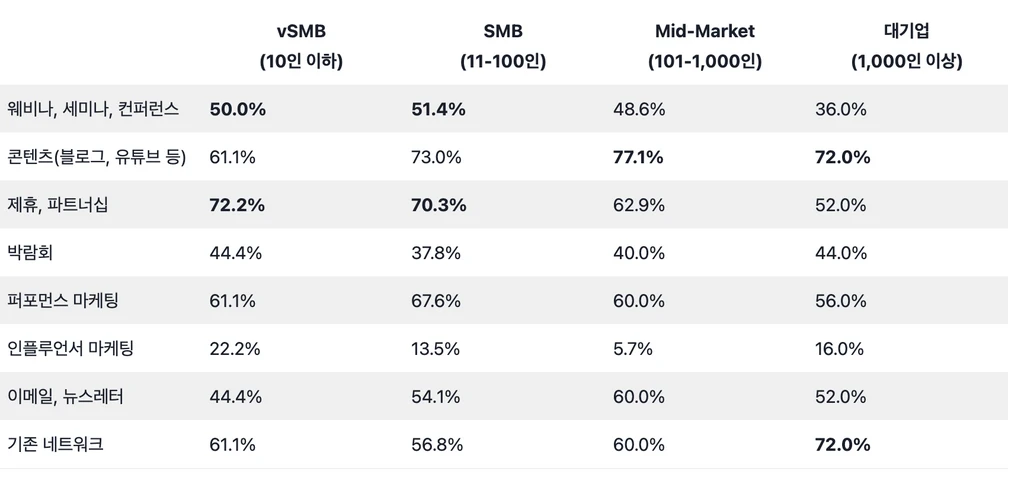 대기업, 엔터프라이즈를 타겟하는 B2B 기업의 경우 콘텐츠와 기존 네트워크를 가장 많이 활용합니다.