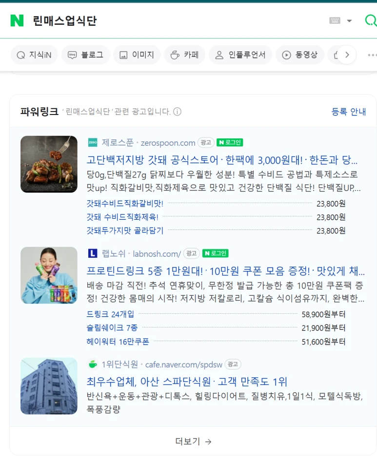 어 그런데 린매스업 식단은 안티에이징 화장품하고 다르게, 파워링크 광고 노출 위치가 다르네요?!