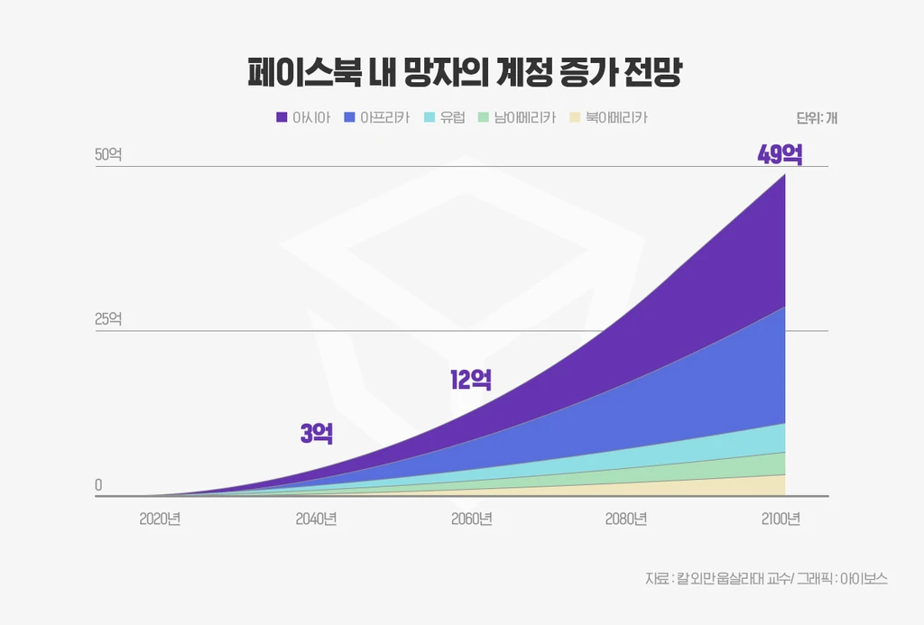 얼마 전, <데이터의 사후세계="">를 쓴 칼 외만 교수의 데이터를 보게 되었습니다. 칼 외만 교수의 추정에 따르면 2060년이 되면 페이스북에는 죽은 사람의 계정이 12억 개를 돌파할 것이고, 2100년 쯤에는 49억 개를 넘을 것으로 보았습니다. 그리고 22세기 초가 되면 사망자의 계정이 살아있는 사람의 계정을 초과할 것이라는 전망도 이야기했죠.데이터의>