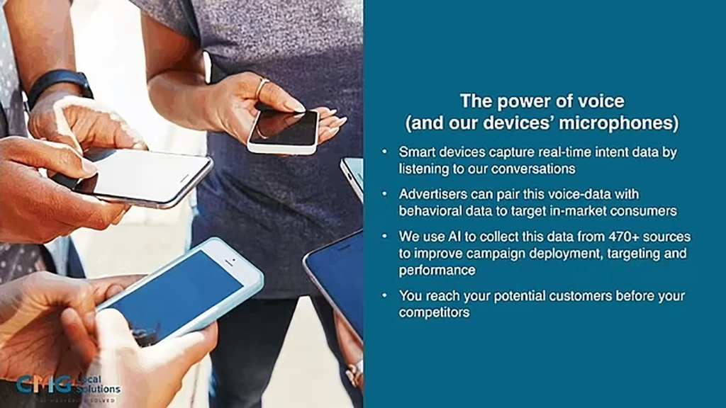 액티브 리스닝 기술을 활용하면 스마트폰이나 노트북의 마이크로 사용자들의 대화를 실시간으로 수집하고 분석해 맞춤형 광고에 사용할 수 있다고 홍보했는데요. 이렇게 분석한 음성 데이터를 다양한 경로로 수집한 행태 데이터와 결합하면 구매 의사가 있는 소비자를 정밀하게 타기팅할 수 있다고 설명합니다.