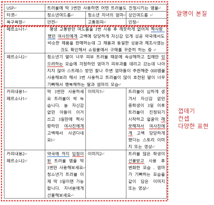 그리고 어느정도 USP와 제품의 욕구 욕망이 어떤것으로 기인하고 페르소나가 잡혀 있다고 하면 그 페르소나에서 변화구를 다양하게 줄 수 있으니 위 기본 본질에 대한 부분이 가장 중요하다는 걸 잊지마세요!! 계속 반복해서 이야기 하는 , USP 와 타겟 페르소나 ! 위 내용 기반으로 잡아두고 머리속에 기본 탑재한 상태에서 페르소나를 기반으로한 변화구 컨셉! 꼭 기억하세요!