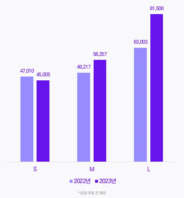 매출 규모별로 S, M, L 세 그룹으로 나누었으며, 22년도 59곳의 회사와 23년도 181곳의 데이터 중 유의미한 데이터만을 바탕으로 이커머스 산업의 성과 분석을 해보았습니다.