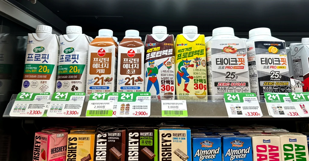 편의점 매대에 진열된 단백질 음료들 (사진: 직접 촬영)