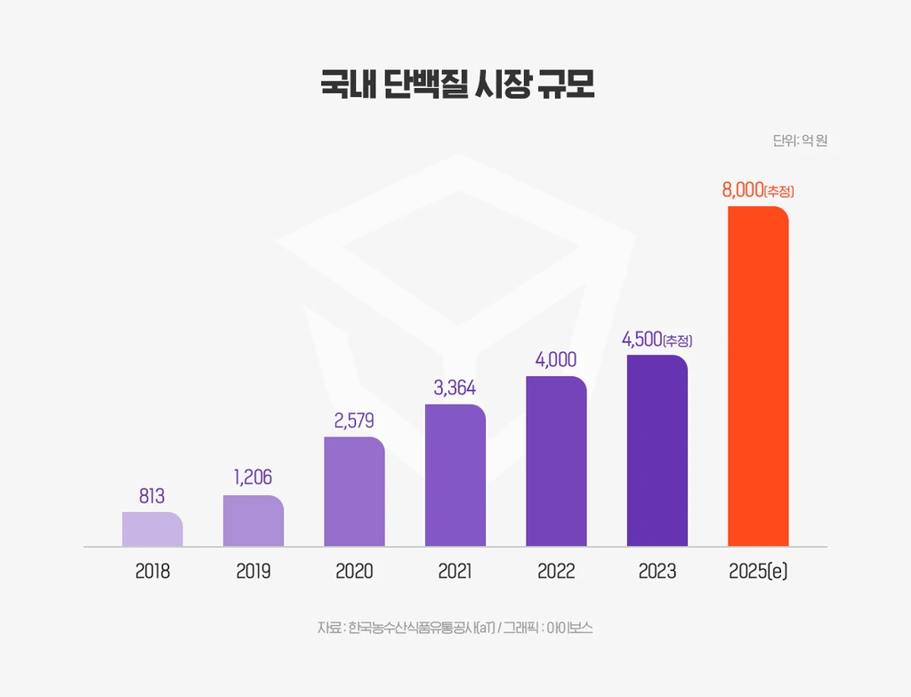 한국농수산식품유통공사(aT) 자료를 살펴보면 국내 단백질 식품 시장의 규모는 2018년 약 800억 원 수준이었습니다. 그러다가 지난 2023년에는 4500억 원 수준으로 급증한 것으로 나타났습니다. 5년 만에 관련 시장이 5배 이상 증가한 것인데요. 업계에서는 2026년까지 8천억 원 규모로 성장할 것으로 내다보고 있어요. 이렇게 단백질 식품 시장이 가파르게 성장할 수 있었던 것에는 몇 가지 이유가 있습니다.