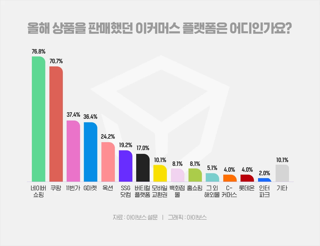 다음으로, 가장 성과가 좋지 않았던 플랫폼을 묻는 질문에 대한 응답은 비교적 고루 분포된 모습인데요. 다만, 11번가 22%, G마켓 19.2%, 옥션 12.1%로 종합몰 형태의 오픈마켓 플랫폼들이 상위권을 차지했어요. 곧바로 쿠팡과 네이버쇼핑이 각각 11.1%, 10.1%로 뒤를 이었죠. 11번가, G마켓, 옥션을 합치면 53.5%로 오픈마켓의 성과가 저조했다고 응답한 이용자가 많다는 걸 확인할 수 있어요.